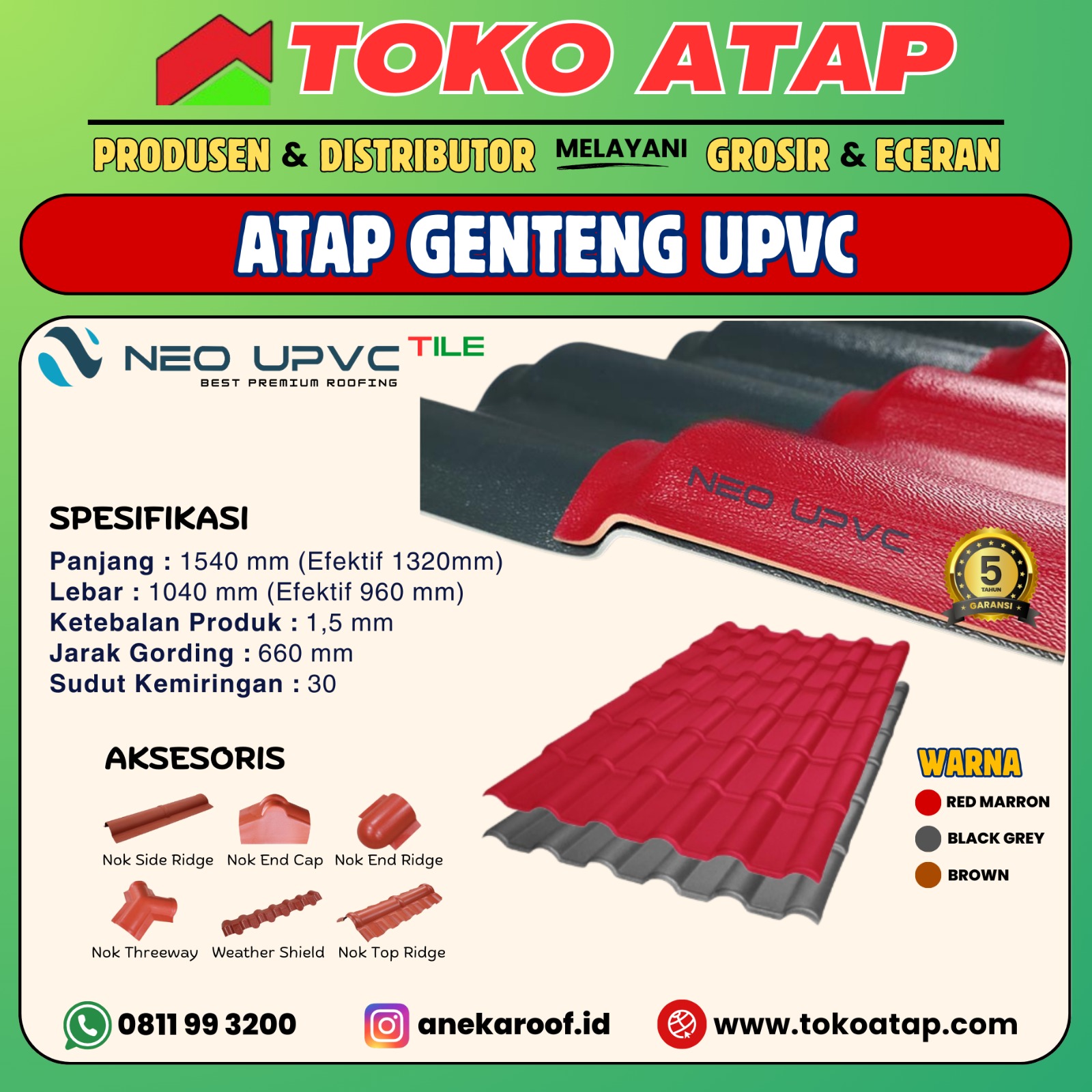 Tentang UPVC Tile Genteng UPVC Neo adalah produk terbaru dari NEO UPVC yang hadir untuk menginovasi Genteng konvesional dengan material UPVC yang menjadikan Genteng lebih kuat, ringan, anti karat dan lebih dingin. Lebih Estetik & Lebih Modern Menggunakan material RF Premium Series, Menjadikan genteng anda lebih sejuk, lebih kuat & kokoh. Pilihan Warna Red Marron & Black Grey
